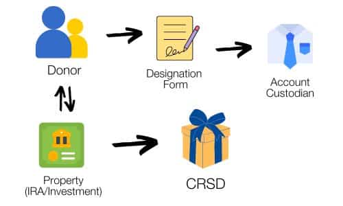 Flowchart: Donor executes designation form with account custodian to designate CRSD as beneficiary of a retirement, investment or bank account.